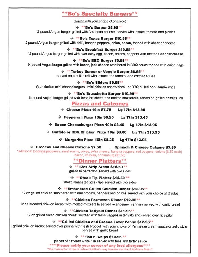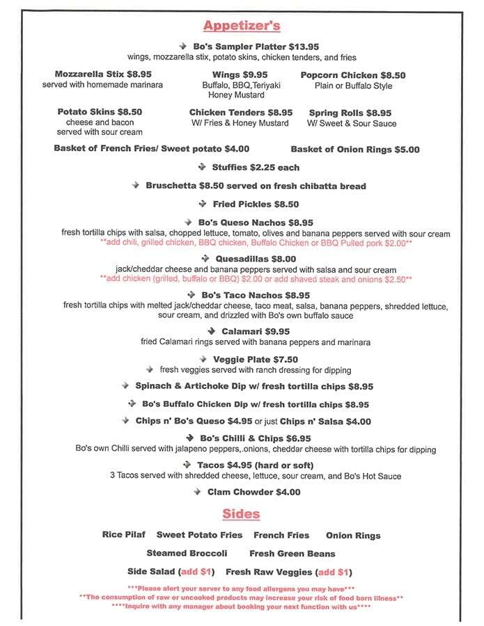 MENU FOR BO'S BAR AND BILLIARDS IN WARWICK, RI